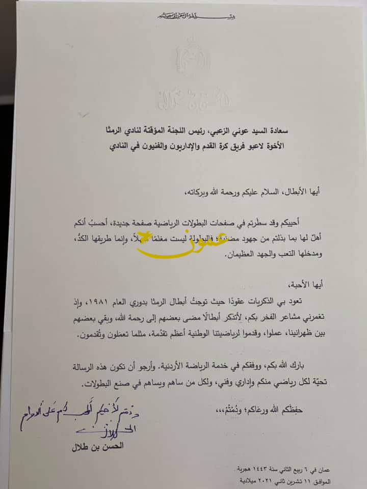 عمون - وجه سمو الأمير الحسن بن طلال رسالة تهنئة لرئيس اللجنة المؤقتة لنادي الرمثا ولاعبي الفريق والاداريين والفنيين بالنادي بمناسبة تحقيقهم لقب الدوري.