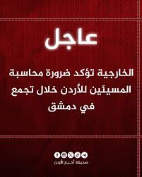 دانت وزارة الخارجية وشؤون المغتربين اليوم الإساءات للأردن خلال تجمّع شهدته العاصمة السورية دمشق، وأكّدت ضرورة محاسبة المسؤولين عن هذه الإساءات.